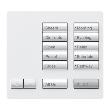 Lutron RadioRA 2 Tabletop Designer Keypad with Raise and Lower, All On and All Off RadioRA 2 Tabletop Designer Keypads provide homeowners with a simple and elegant way to operate lights, shades, draperies, motorized screens, and many other devices. Features large, easy-to-use buttons, plus a unique backlit engraving option that makes the keypads readable for your clients, any time of the day or night.