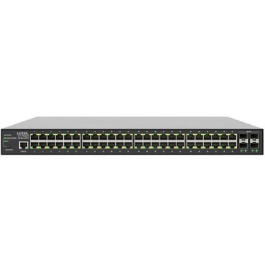 The SW-615-48P-F is a 48 port PoE+ front-facing single space rackmount 1Gb switch with 4 SFP+ 10Gb ports (aggregable up to 40Gbps) with a total PoE power budget of 740W. Each of the SFP+ ports can be used alone or aggregated together to allow 20 or 40Gbps throughput to another switch. This L2/L3 switch with 176Gbps switching capacity provides VLAN, QoS and other powerful management features. Up to 16 switches can be grouped in a single pane user-interface allowing easy and comprehensive administration. Variable speed fans for quiet operation. ProWatch Integrated for support of remote monitoring and management. ACL ingress and egress filtering.