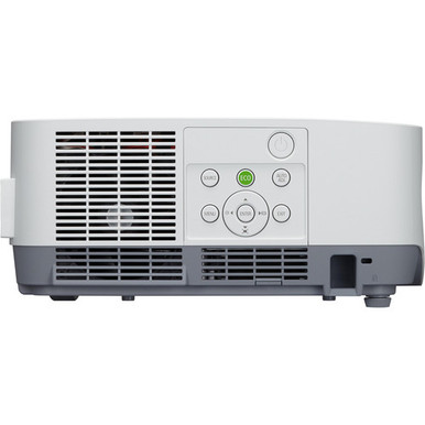 The NP-M283X offers a throw ratio of 1.24 to 2.1:1 with 1.7x zoom. Its connections include HDBaseT, VGA, composite video via RCA, two HDMI, and an RCA stereo and 3.5mm mini input for audio. It also features 15-pin VGA video and 3.5mm mini audio outputs. Images can be shown via USB from an external drive for added versatility. The projector has a 20W speaker built in, and includes a VGA cable and remote control.