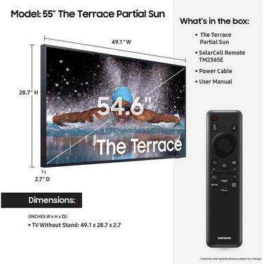 Elevate your pool parties and backyard BBQs with big-screen entertainment when you add the Samsung The Terrace 55 Class HDR UHD 4K Smart Partial Sun Outdoor QLED TV to your patio or deck. The specialized Neo QLED screen is engineered to provide a brilliant 4K image in shaded outdoor spaces.